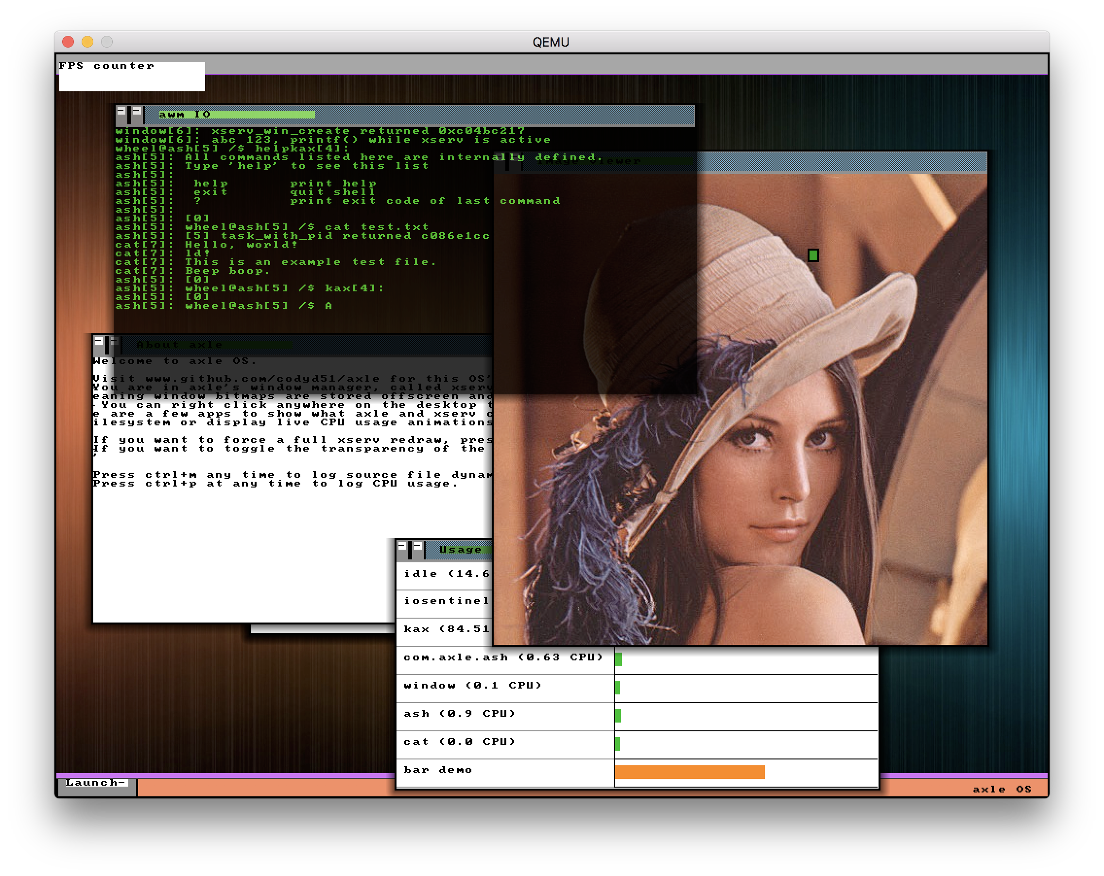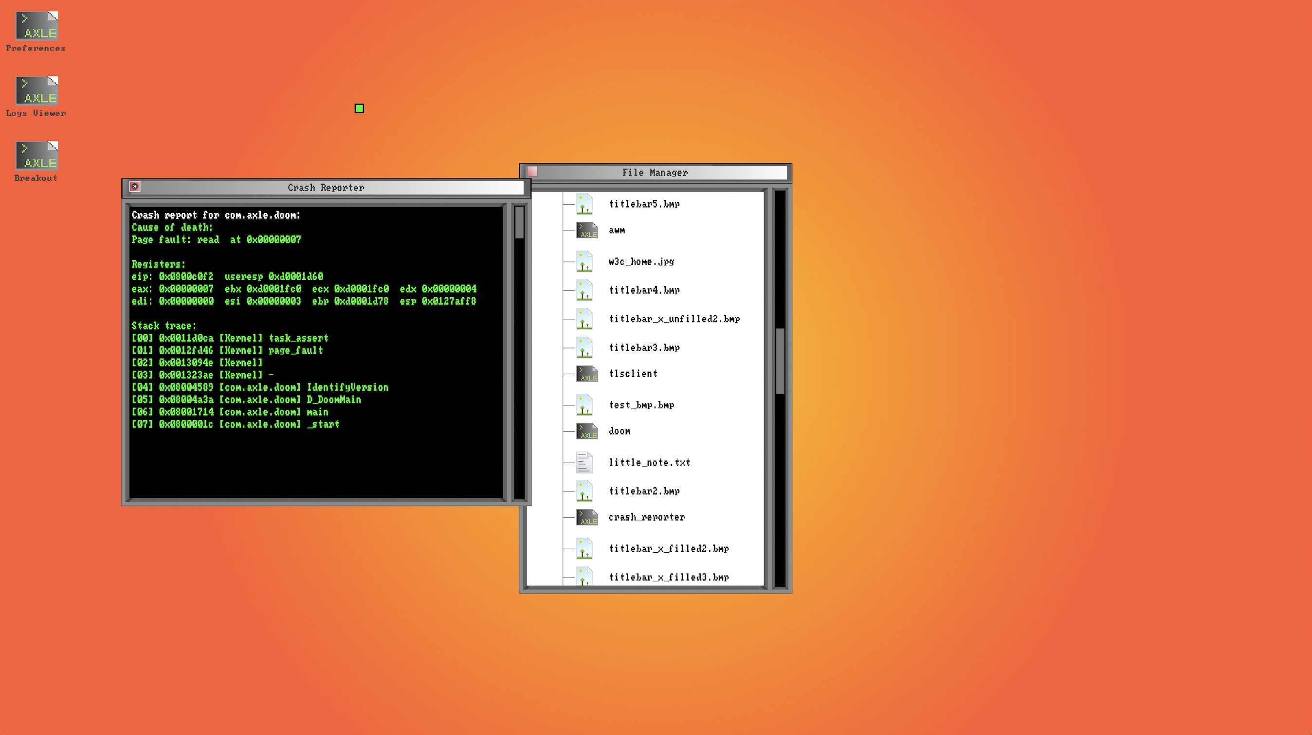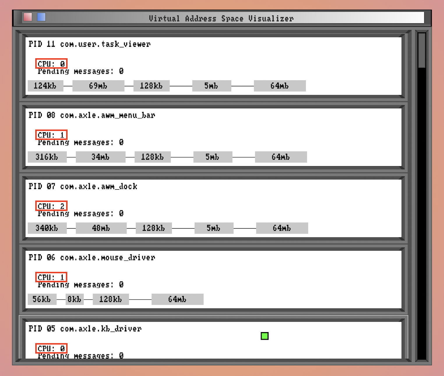 axle OS is a hobby microkernel and userspace. I started the project in early 2016, and have had stints of working on it
